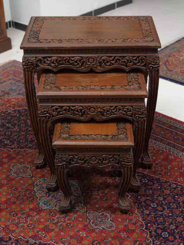 Hnízdové stolky v orientálním stylu z období kolem roku 1980 představují elegantní a dekorativní doplněk interiéru. Sada se skládá ze tří stolků různých velikostí, které lze zasunout do sebe a prakticky tak šetřit prostor. Jsou vyrobeny z masivního dřeva a bohatě zdobené ručním řezbářským dekorem s rostlinnými a květinovými motivy, typickými pro orientální a koloniální nábytek.